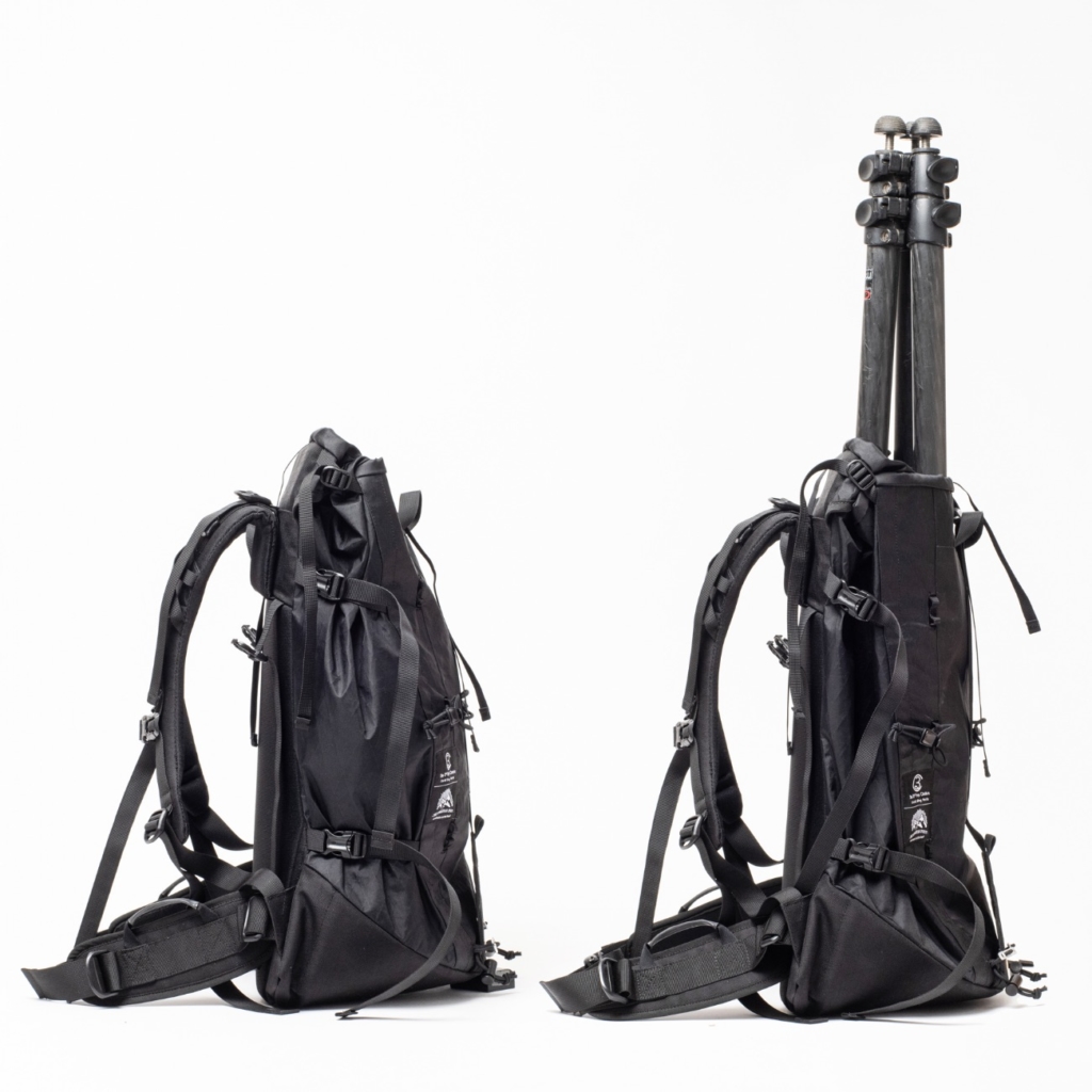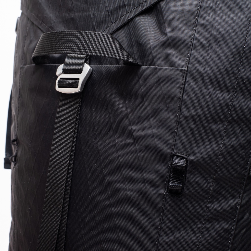 サングラスやエマージェンシーキットといった立体物も収納可能な中容量リッド(雨蓋)は、シンプルな動作で使用できる3点固定式を採用。主気室の荷物に適切なコンプレッションをかけることで内容物の重心を安定させることが可能です。また、本体から簡単に分離可能なバックル&メタルフックによる固定で、荷物が少ない場合やコンパクトに扱いたいシチュエーションにも対応します。さらにリッドの下に接する主気室メイン開口部は、余裕を持ったサイズの吹き流し構造によって荷物の増減やロープ/ ジャケット等の挟み込み運搬にも対応します。さらに、吹き流し部を固定するストラップには前後双方向にアジャスターを備えたクイックリリースを選択。ロープ/ ジャケット等の挟み込んで運搬する際、前後方向から均等なテンションで固定することが可能です。